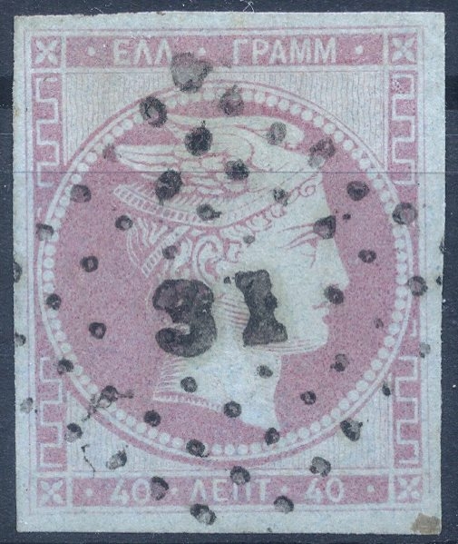 Lot0013 - ΕΛΛΑΔΑ 1861 40 λεπτά μωβ άτονο σε μπλε (dull mauve on blue) με λέπτυνση ☉