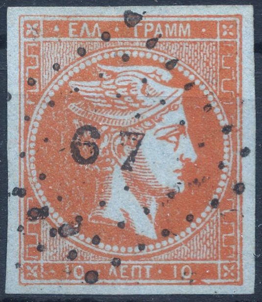 Lot0092 - ΕΛΛΑΔΑ 1862-1867 10 λεπτά κίτρινο πορτοκαλί σε μπλε (yellow orange on blue) με σφάλμα πλάκας και σφραγίδα ☉