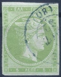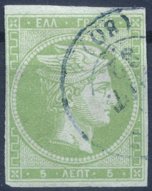 Lot0174 - ΕΛΛΑΔΑ 1871-1876 5 λεπτά κιτρινοπράσινο (yellow green) με παραμορφωμένο ΑΕ & μπλε σφραγίδα, σπάνιο ☉