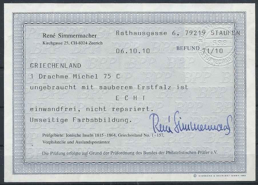 Lot0297 - ΕΛΛΑΔΑ 1886-1888 1 δραχμή με πιστοποιητικό, Βέλγικη έκδοση *