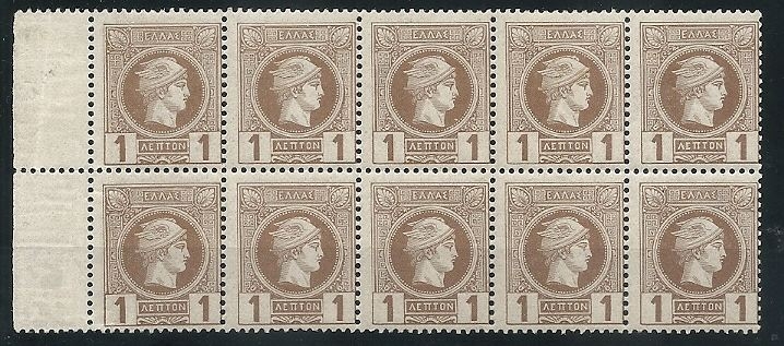 Lot0293 - ΕΛΛΑΔΑ 1889-1891 1 λεπτό, ανεπίσημη οδόντωση 13 1/2, σε δεκάδα **/bl10
