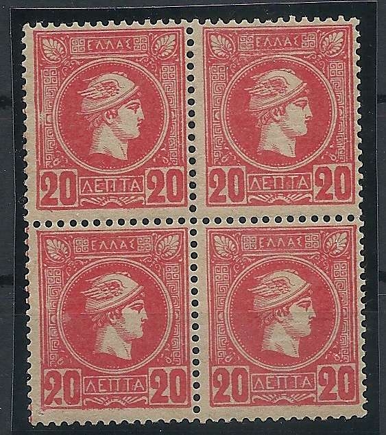 Lot0310 - ΕΛΛΑΔΑ 1889-1890 20 λεπτά, οδόντωση 13 1/2, πορτοκαλί (orange), τεράδα, 1η περίοδος **/bl4