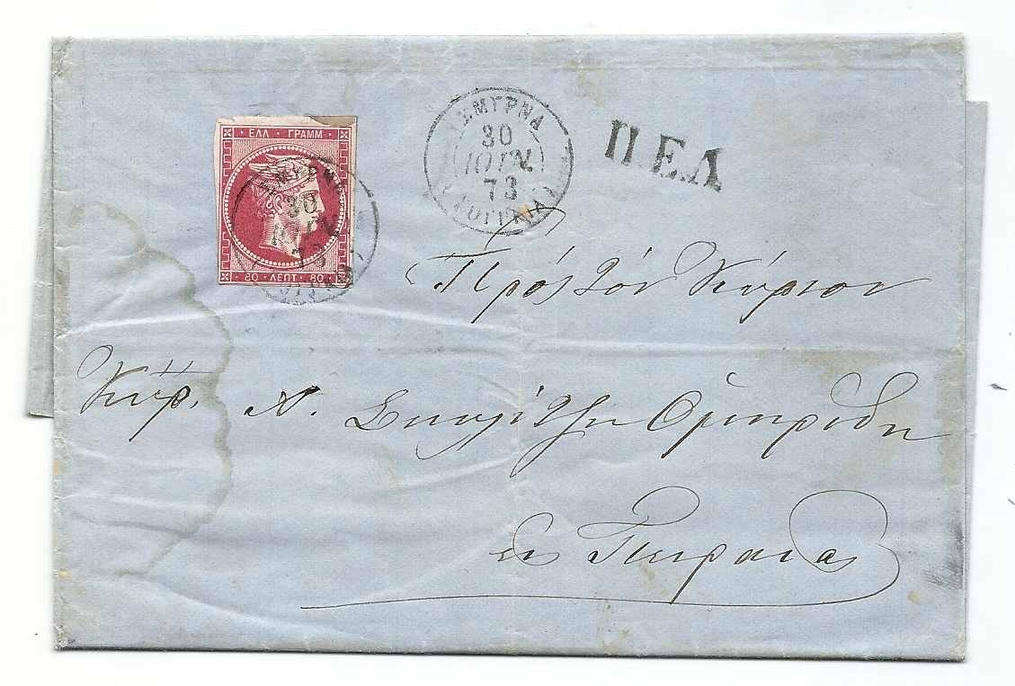 Lot0353 - ΕΛΛΑΔΑ 1873 ολόκληρη επιστολή από ΣΜΥΡΝΑ 30-6-1873 προς ΠΕΙΡΑΙΑ 2-7-1873 με 80 λεπτά συνεχών εκδόσεων και σφραγίδα ΠΕΛ (Πληρωμένο έως Ελληνικόν Λιμένα) ✉